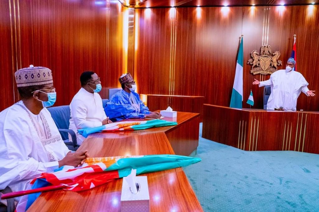 President Buhari receiving Sample copies of Nomination form for the forthcoming APC Ward/Local/State and National Convention from APC Chairman Caretaker Committee and Yobe State Governor H.E. Mai Mala Buni in State House.