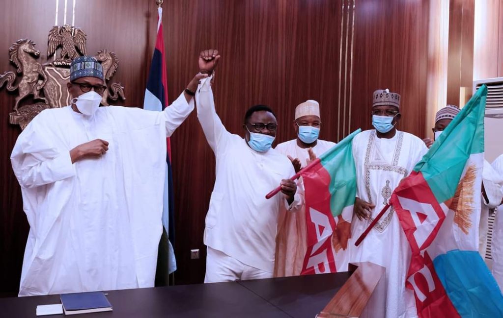 President Buhari presenting APC Flag to Prof. Ben Ayade of Cross RIver State.