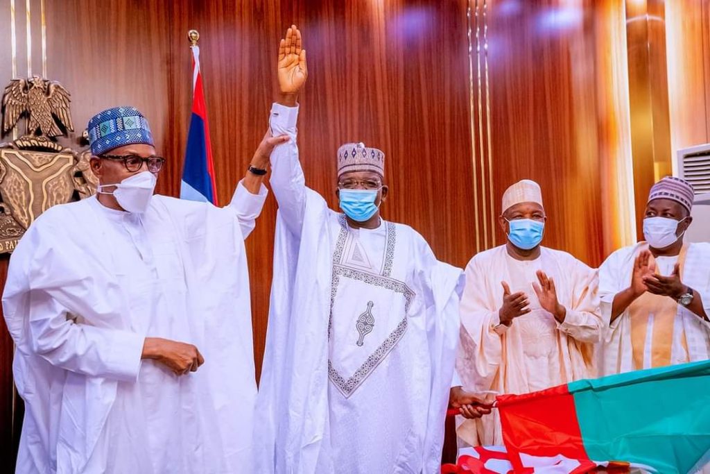 President Buhari presenting APC Flag to Governor Bello Matawalle of Zamfara State.