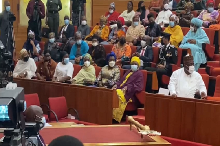 During Plenary the Senate leader Abdullahi Yahaya citing order 12 of the standing order to invite the First Lady Mrs Aisha Buhari and other female ministers into the chamber to witness the presentation of the report of the Committee on Constitution Amendment.