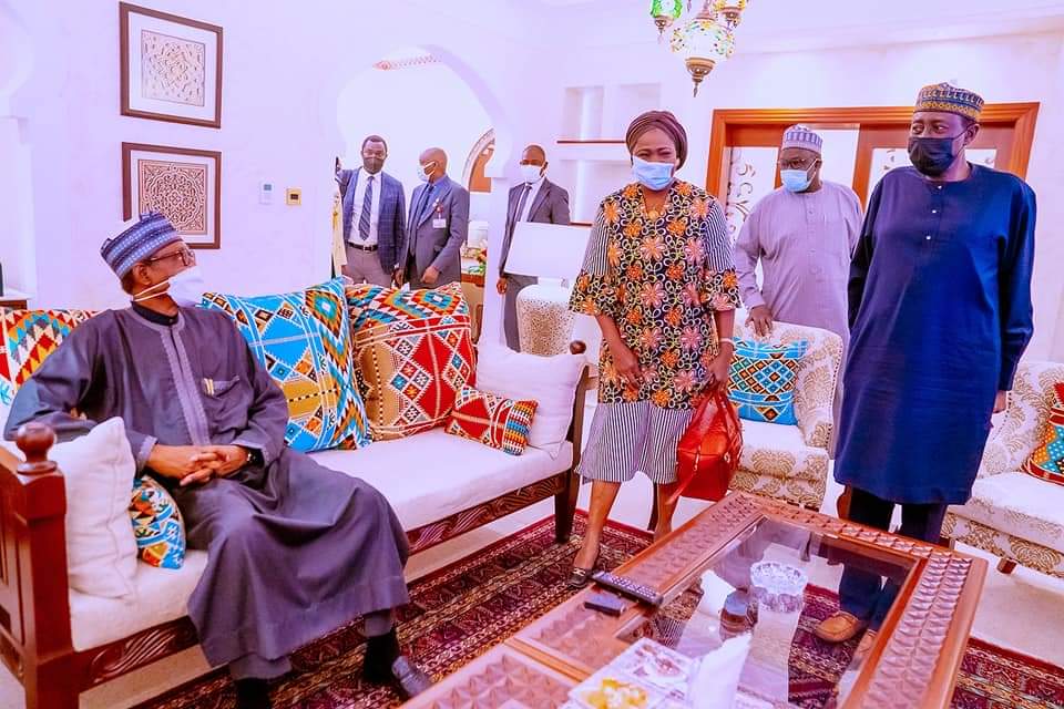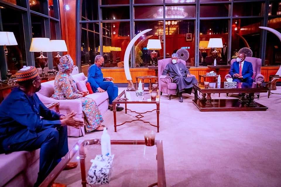President Buhari with Kenyan Minister of Transportation James Nchanga alongside Minister of Foreign Affairs Geoffrey Onyeama, CEO Diaspora Commission Abike Dabiri and NSA Babagana Monguuno