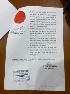 Justice Simon Amobeda delivered the judgment, restraining the respondents, including the Attorney General of Kano State, Nigeria Police Force, and others, from arresting, detaining, or harassing the Emir.