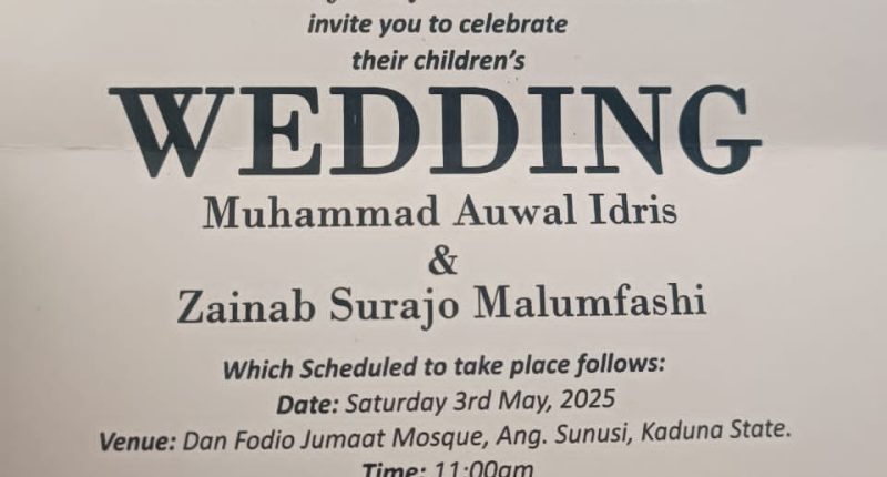 The wedding ceremony is scheduled to take place on Saturday, 3rd May, 2025, at the Dan Fodio Jumaat Mosque, Anguwan Sunusi, Kaduna State.