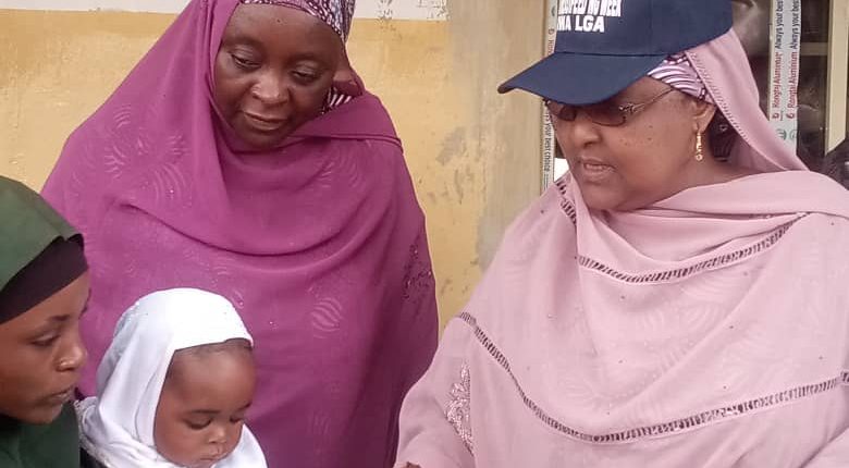 Wife of the Chairman, Hajiya Hadiza Ahmad Sama’ila Yakawada (wearing a cap), pictured alongside Hajiya Talatu Bello, the Essential Drugs Officer, and a nursing mother.